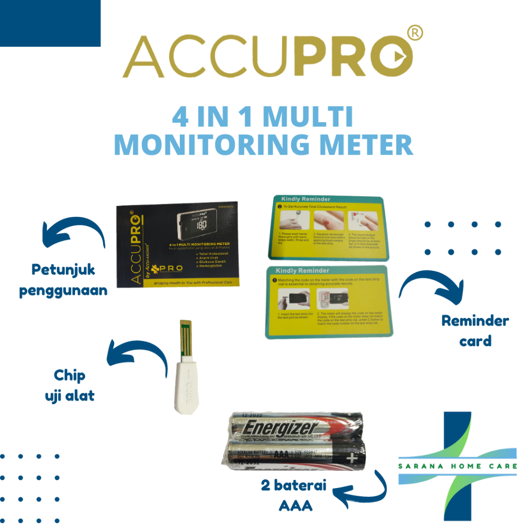 Dalam box berisi : 1 Meter ACCUPRO 4 in 1 10 Strip Total Cholesterol 10 Strip Blood Glucose 10 Strip Uric Acid 10 Strip Hemoglobin 1 Lancing Device 40 Blood Lancet 1 User Manual English 1 User Manual Indonesia 1 Carrying Bag 2 Battery