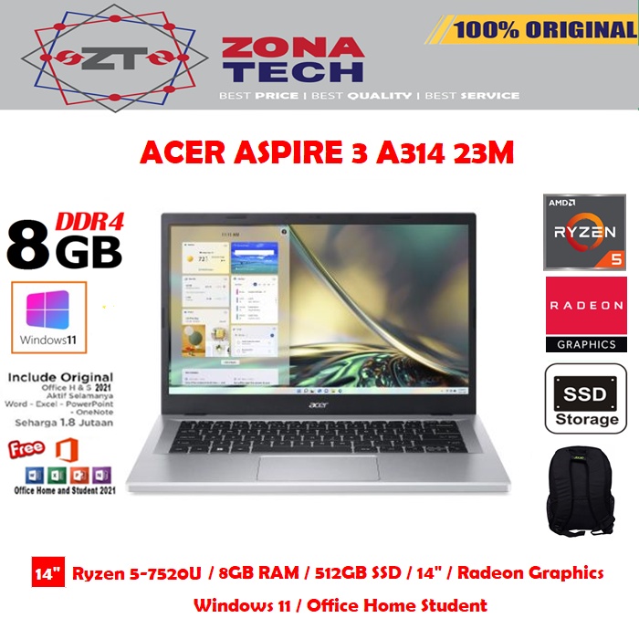 • CPU : AMD Ryzen™ 5 7520U CPU Cores 4, Threads 8, 2.8GHz Up to 4.3GHz • OS : Windows 11 Home • LCD : 14" HD 1366 x 768 resolution Acer ComfyView™ • Memory : 8 GB LPDDR5 Dual Channel • Storage : 512 GB SSD NVMe • Graphic : AMD Radeon™ 610M • Bluetooth : Bluetooth® 5.0