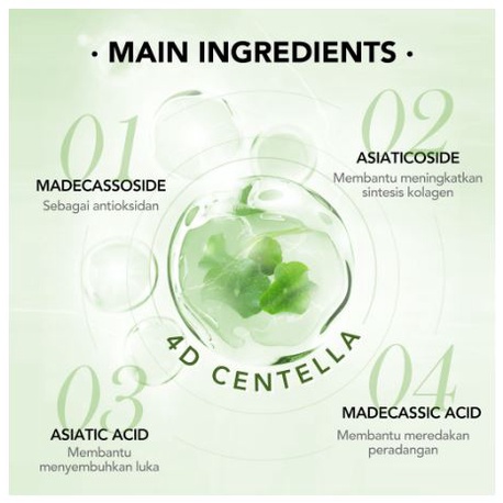- Centella Asiatica Extract: Menenangkan kulit, meredakan peradangan, dan anti-bakteri.
