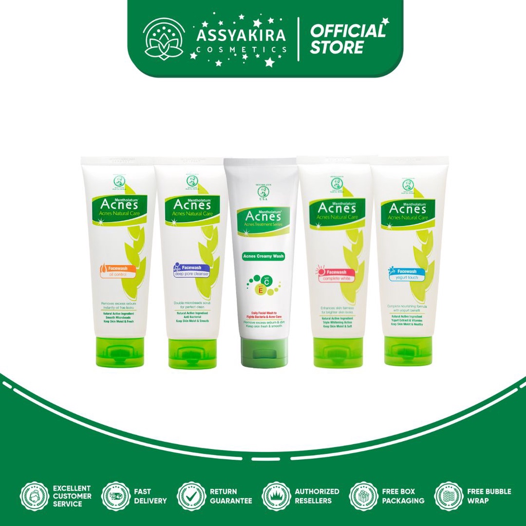 Acnes Natural Care Face Wash 50gr 1. Facewash Yogurt Touch, mengandung Yogurt extract yang dapat menjaga tekstur kulit agar selalu halus dan menutrisi kulit agar lembap dan sehat 2. Facewash Oil Control, mengandung kombinasi 8 extract tanaman untuk oil control yang mengurangi minyak berlebih dan mencegah jerawat 3. Facewash Complete White, mengandung triple whitening; Bearberry extract, Arbutin dan Vitamin C yang dapat mencerahkan kulit dan mengurangi flek hitam 4. Facewash Deep Pore Cleanser, mengandung Double Micro ead dari natural scrub yang dapat mencegah komedo dan membersihkan sel kulit mati.
