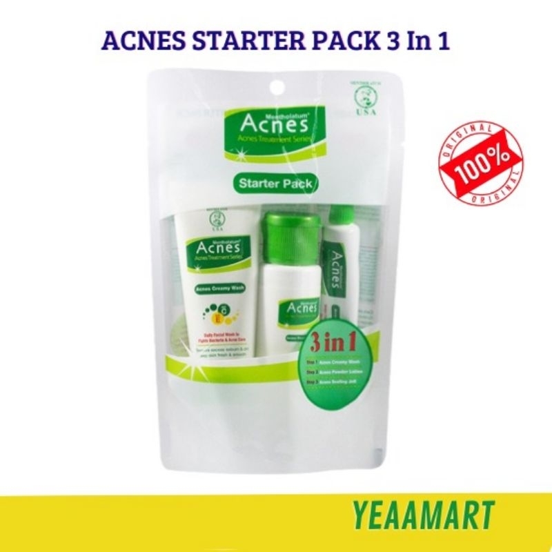 ACNES Starter Pack (Paket Perawatan Wajah berjerawat) STEP 1: Acne Creamy Wash 20ml - Pembersih wajah yang menghilangkan minyak berlebih dan kotoran tang dapat menyumbat pori - Anti Bakter - Nutrisi Bagi kulit, diperkaya vit C, E, merawat kelembutan kuliti STEP 2: Acnes Powder Lotion 20ml - Merawat Kulit Berjerawat: mengandung menthol untuk memberi rasa sejuk, dan nyaman. Oil COntrol agent menyerap kelebihan minyak (sebum), menjaga kulit tidak emngkilap - Anti Bakteri mengandung Isopropyl Methylphenol - Nutri Bagi Kulit, dengan vit C dan Aloe Vera STEP 3: Acnes Sealing Jell 5gr Merawat kulit berjerawat, Cocok untuk kulit berminyak dan kasar. menjaga kesehatan dan kelembutan kulit 4 manfaat merawat kulit berjerawat: - Anti bakteri - Acne Care - Skin Nutrition: Vit E, B6 sbg antioksidan serta menjaga kesehatan dan kelembutan kulit