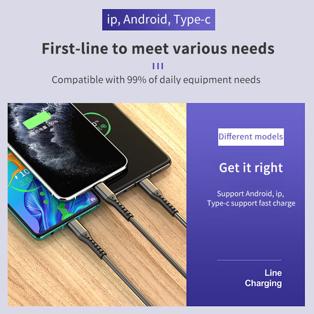 Detail Actual 2022 terbaru 3in1 M300 pengisian cepat 6A 66W Micro + TypeC + for iphone 120cm mendukung pengisian cepat / pengisian cepat