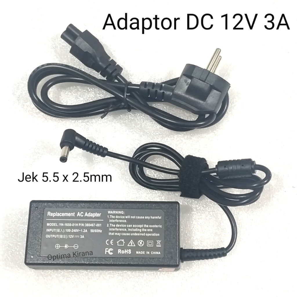 Adaptor atau power Supply untuk Monitor Komputer LED/LCD atau alat elektronik lainnya dengan output keluaran DC 12V 3A jek colokan bulat 5.5 x 2.5mm.