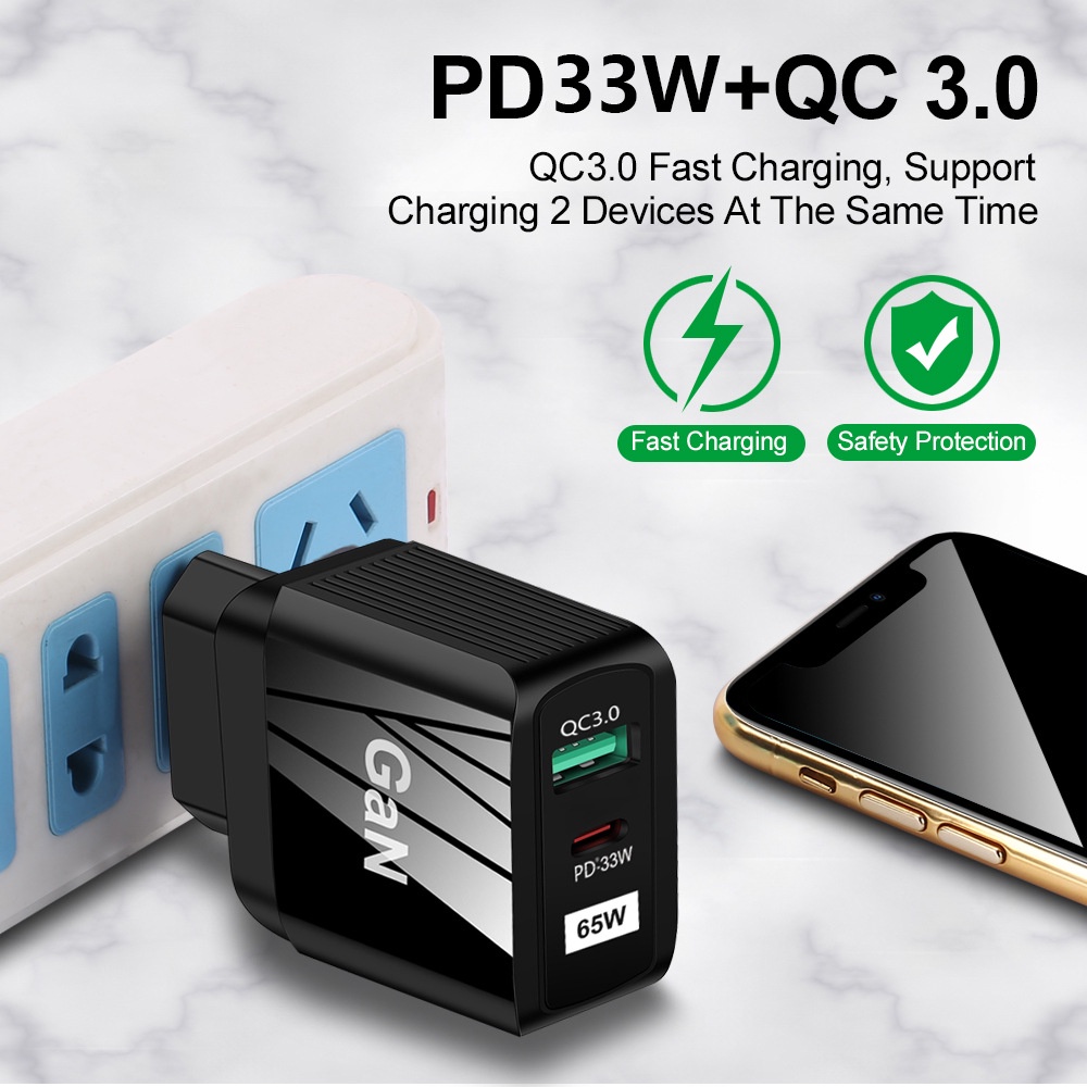 Detail Adapter Charger 65W GaN 9V12V Untuk Iphone 13 14 i-Pad H-uawei X-iaomi S-amsung QC3.0 + PD33W Android