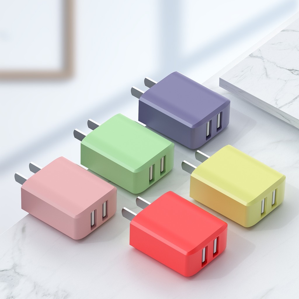 Macaron color 5V2A liquid fast charge charger dual USB adapter suitable for Apple Android Huawei phones Product name: Macaron color dual USB adapter Color: red/pink/green/purple/yellow Applicable models: Android/Apple/Type-C Product current: 5V/2A Material: liquid smooth PC coating + ABS fireproof material Size: about 6*3.8*2.3cm quantity: 1