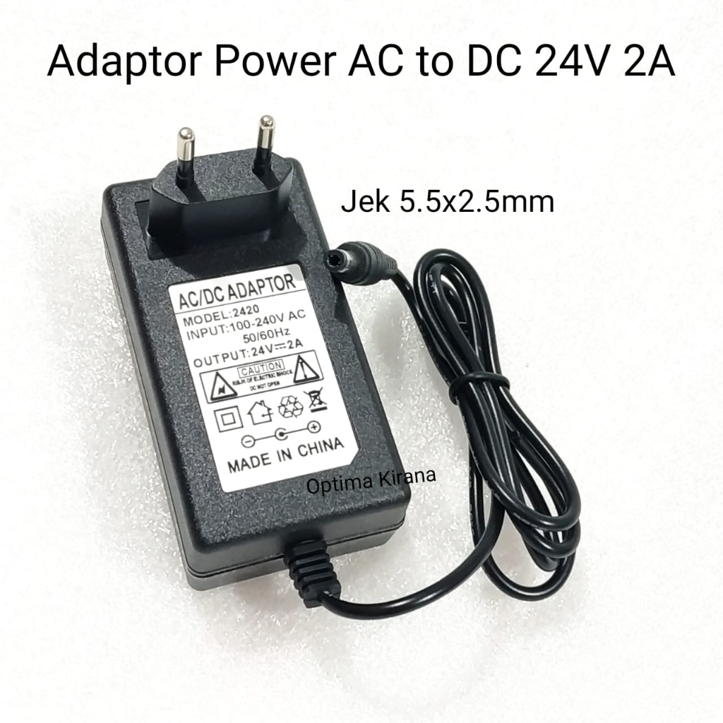 Input : AC 100-240volt Output : DC 24 volt - 2000 mA ( 2 Ampere ), Plug : Jek 5.5mm x 2.5mm. ukuran dimensi lingkaran luar : 5.5 mm dan ukuran dimensi lingkaran dalam : 2.5 mm Model : 2420