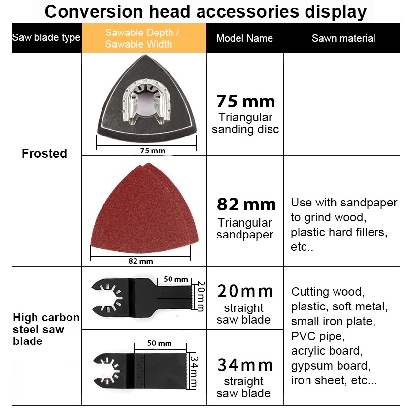 Isi Paket : 1pc x Modified Head 1pc x Adapter Head 2pcs x amplas kayu 1pc x tatakan amplas 1pc x ring pengunci 1pc x Eccentric Shaft 2pcs x kunci pemasangan 1pc x mata gergaji 20mm 1pc x mata gergaji 34mm 1pc x User Manual 1pc x Box