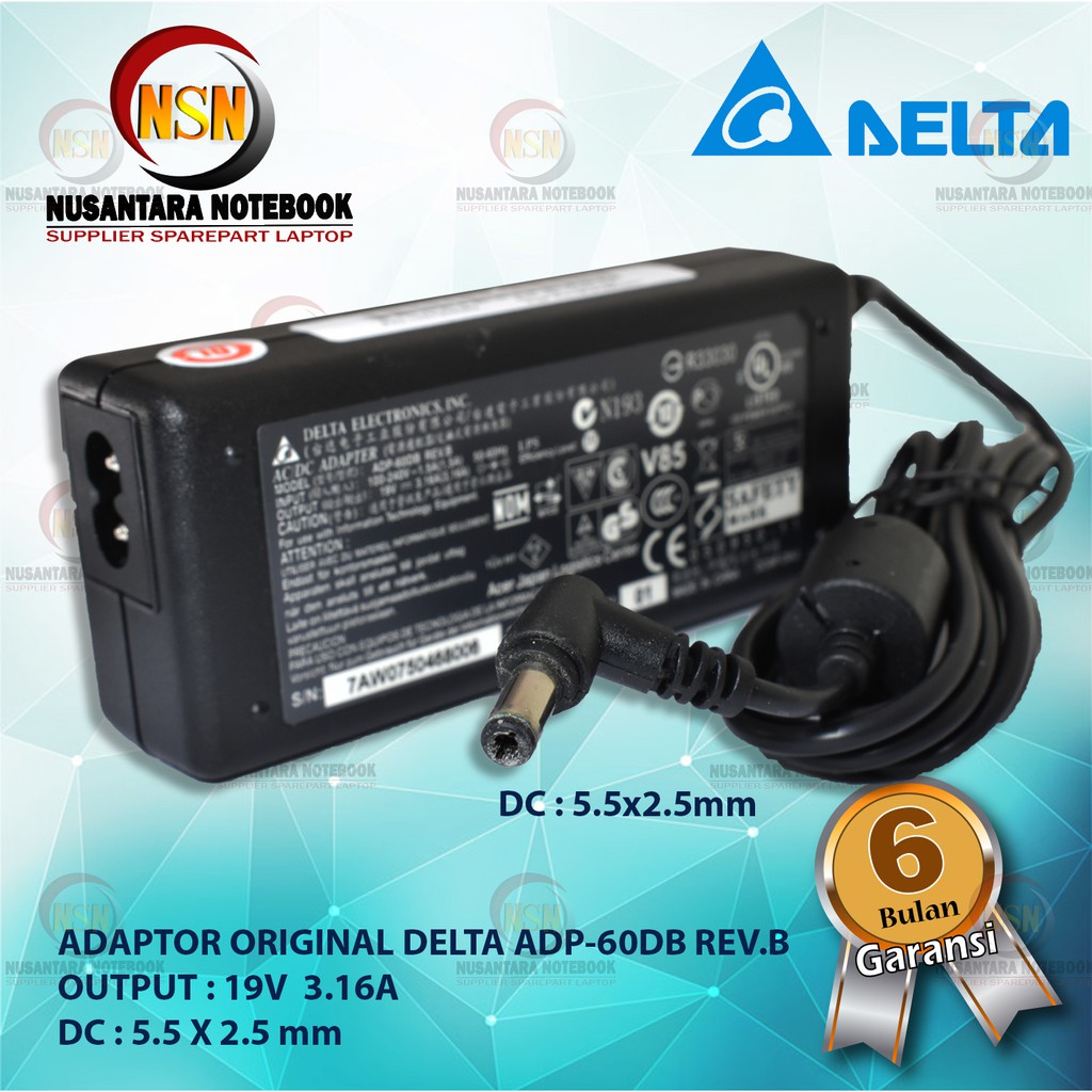 No. Part: Delta ADP-60DB REV.B Kapasitas: 19V 3.16A DC : 5.5 X 2.5mm Garansi: 6 Bulan (Replace Unit)
