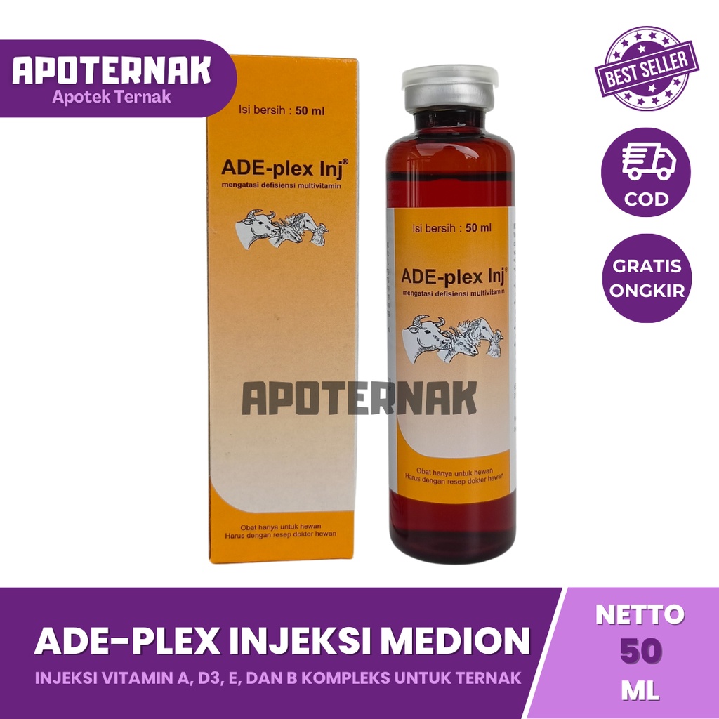ADE-plex Inj merupakan sediaan cair injeksi mengandung Vitamin A, D, E dan B kompleks. Vitamin A berperan dalam membantu pembentukan jaringan mukosa dan epitel, vitamin D berfungsi membantu transport mineral, vitamin E membantu metabolisme hormon dan sebagai antioksidan pada membran, sedangkan vitamin B kompleks membantu dalam meningkatkan nafsu makan dan daya tahan tubuh.