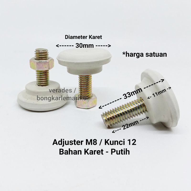Adjuster M8 / Baut 8mm / Kunci 12 Bahan karet warna putih Diameter karet = 30 mm Tinggi keseluruhan= 33 mm Cek foto produk untuk detail ukuran HARGA SATUAN
