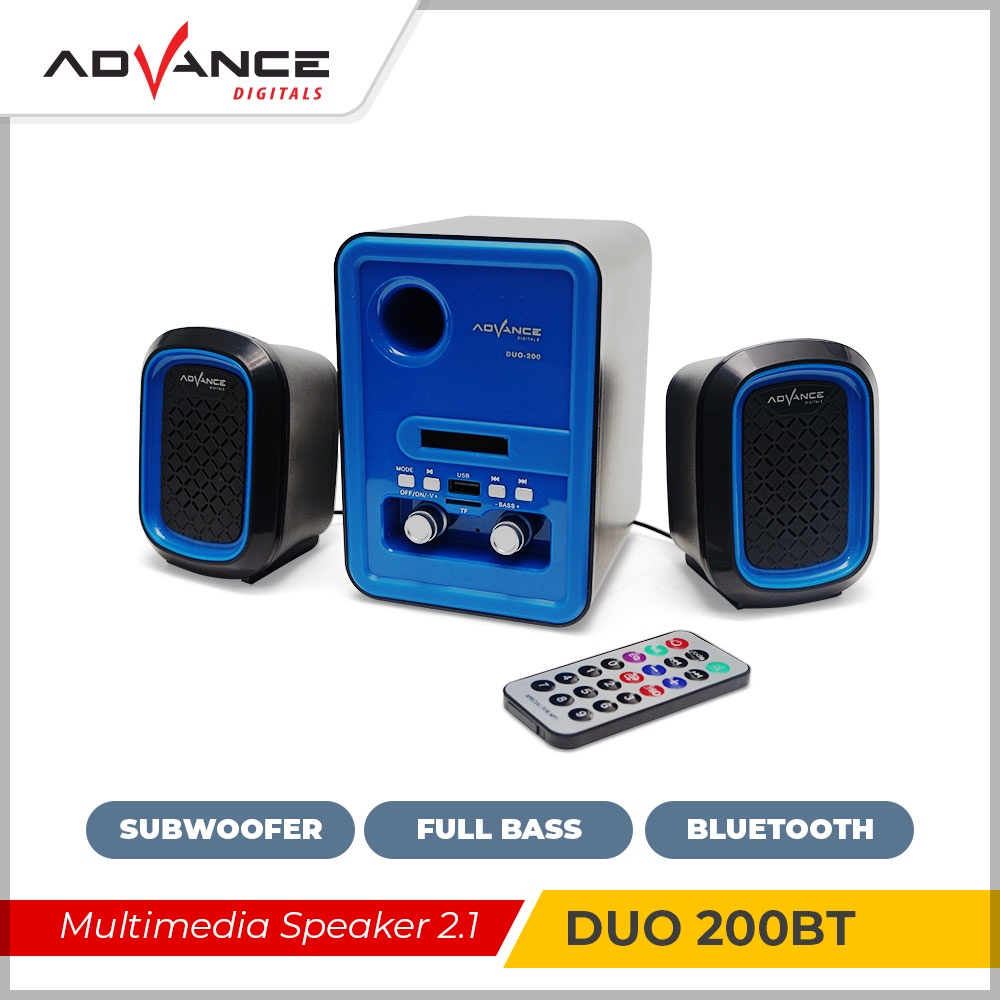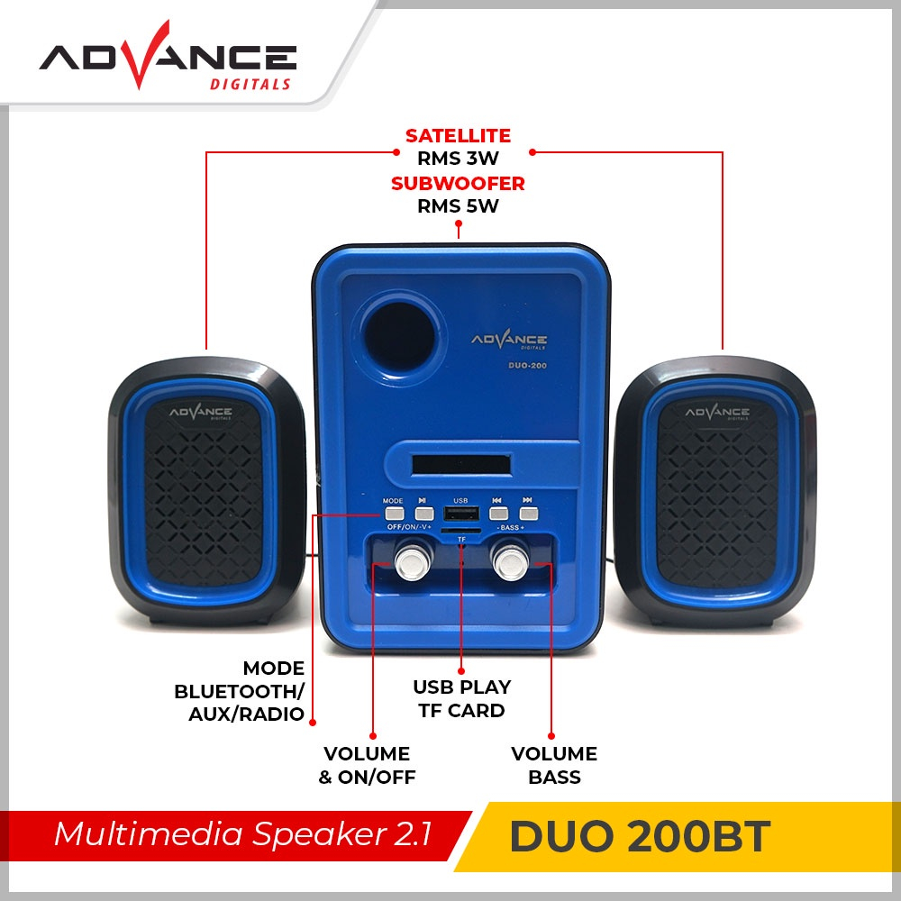 Advance Duo200 Speaker keluaran Advance Digitals yang terdiri dari 2 pcs speaker (satelite) dan 1 Subwoofer dengan konektor USB. Berbahan plastik berbagai warna (Biru, ungu dan merah) dapat mendengarkan musik baik dari Notebook, PC atau gadget (Tablet/Smartphone) yang menggunakan port Jack audio 3.5". Speaker ini sangat bagus dengan suara Bas yang mantab, speaker advance duo 200 tidak memerlukan instalasi driver jadi bisa langsung dengarkan music ketika port Jack 3,5" di colokan.