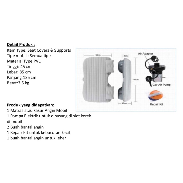 deskripsi kasur angin mobil :Warna / Ukuran sesuai variasi yang dipilih , Tidak berlaku jika cantumkan di cacatan invoice dan chat market place. - HARGA TERTERA UNTUK 1 PC - Isi : * Matras Mobilnya * Dc Electric Pump (pompa elektrik) * Bantal (pillow) 2 * Repairing kit * tas