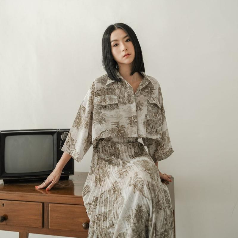 Detail AFI - EC - One Set Wanita Nature Korean Vintage Kemeja Crop & Rok Midi Plisket