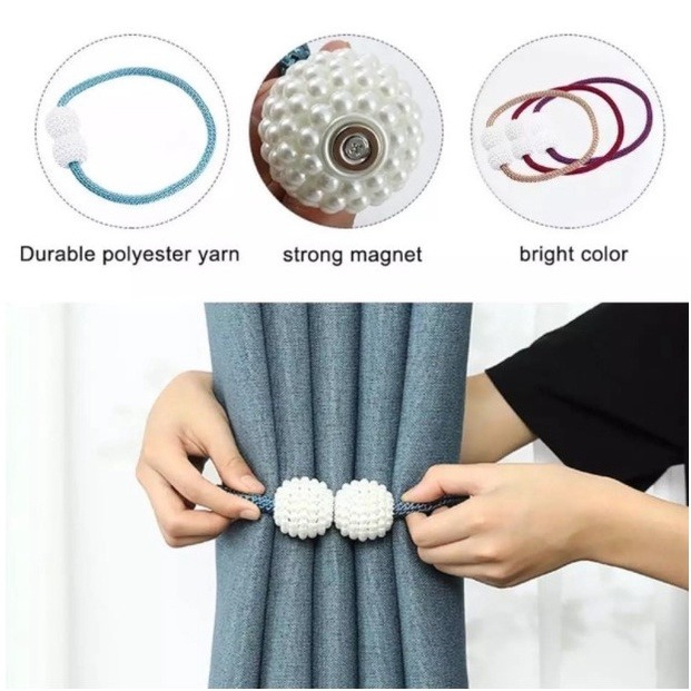 DESKRIPSI PRODUK: Bahan = Polyester Rope, Faux Pearl, Magnet Panjang Tali = 45 cm Diameter Bola = 3 cm Package = x2 Pengikat Tirai (Sepasang) Tipe = Pengikat Tirai