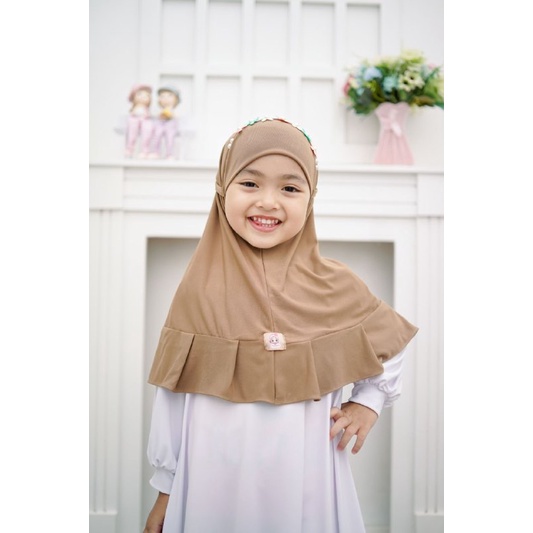 Jilbab anak bergo tali dengan model cantik, dengan variasi renda crown dan aplikasi bunga vintage juga mutiara membuat jilbab ini terlihat mewah dan anggun nih mom, masyaallah ♥️