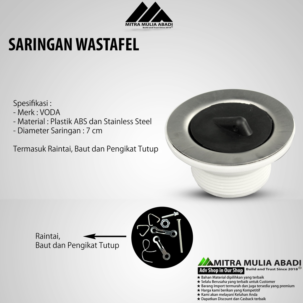 Spesifikasi : - Merk : VODA - Material : Plastik ABS dan Stainless Steel - Diameter Saringan : 7 cm - Cocok untuk Wastafel