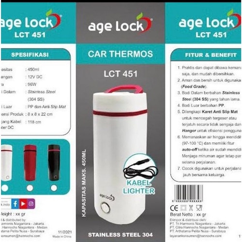 Age Lock Car Thermos LCT 451 Spesifikasi: Kapasitas : 450 ml Tegangan : 12V DC Daya : 96W Bodi Dalam : Stainless Steel (304 SS) Bodi Luar : PP dan Anti Slip Mat Dimensi Produk : 8 x 8 x 22 cm Panjang Kabel Lighter DC : 118 cm