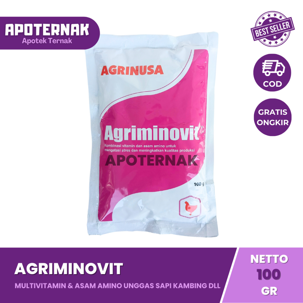 AGRIMINOVIT 100 gr Kombinasi vitamin dan asam amino dalam bentuk serbuk larut air untuk mengatasi stres dan meningkatkan kualitas produksi.