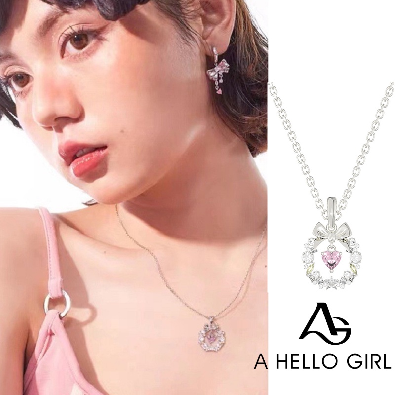 Detail Ahellogirl Kalung Wanita Natal Busur Simpul Wreath Necklace Wanita Cahaya Mewah Desain Niche Sensasi Pink Berlian Hati Baja Titanium Rantai Klavikula