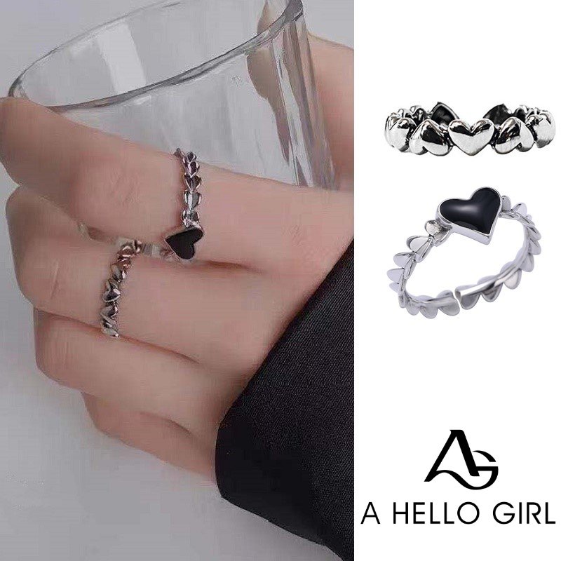 Detail Ahellogirl S925 Sterling Silver Hitam Hati Dihiasi Cinta Cahaya Mewah Korea Cincin Yang Dapat Disesuaikan