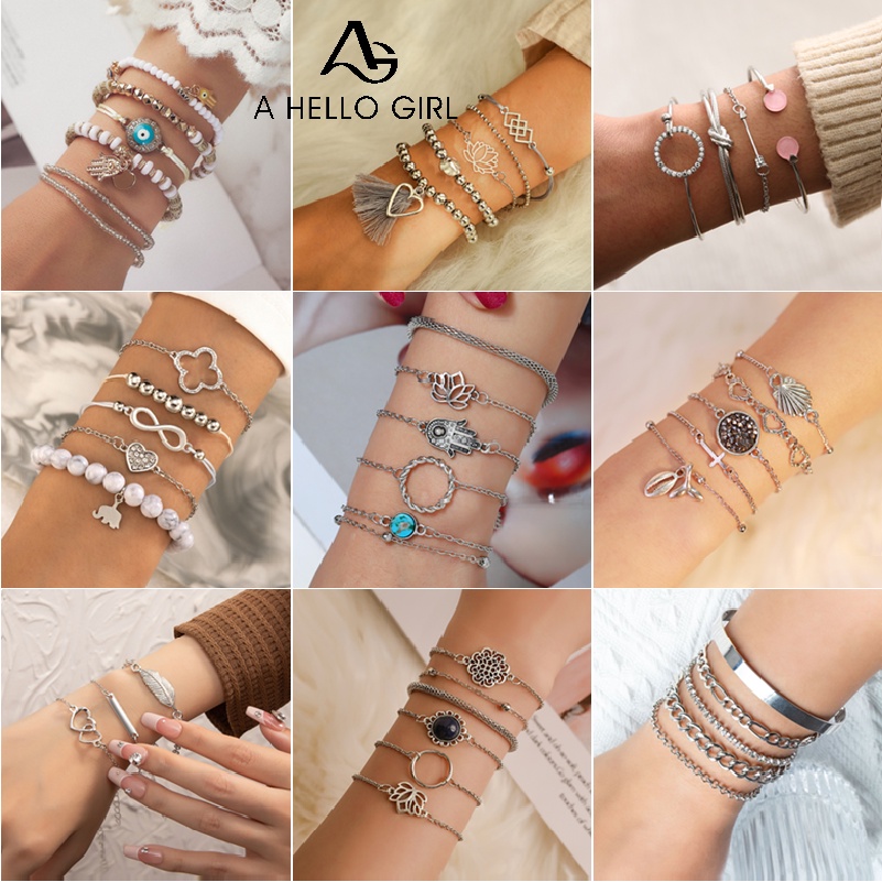 Detail Ahellogirl Set Gelang Silver Vintage Hati Sayap Kacamata Bunga Teratai Pesona Bangle Untuk Wanita Gadis