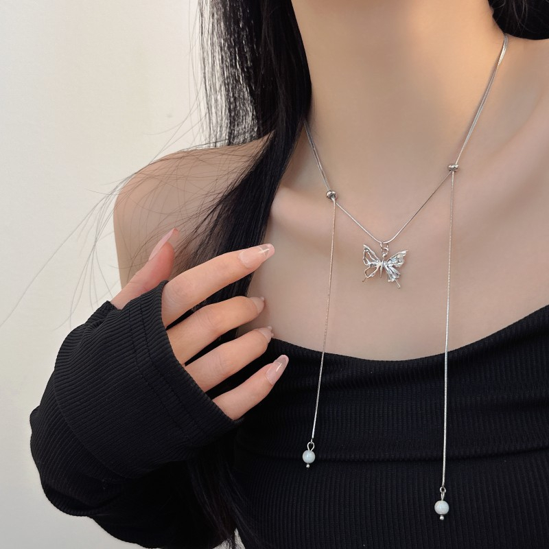 Detail Ahellogirl2023fashion Zirkon Kupu-Kupu Mutiara Rumbai Adjustable Tarik Kalungbutterfly Menarik Tetes Air Perak Kalung Kepribadian Modis Kupu-Kupu Rumbai Kalung