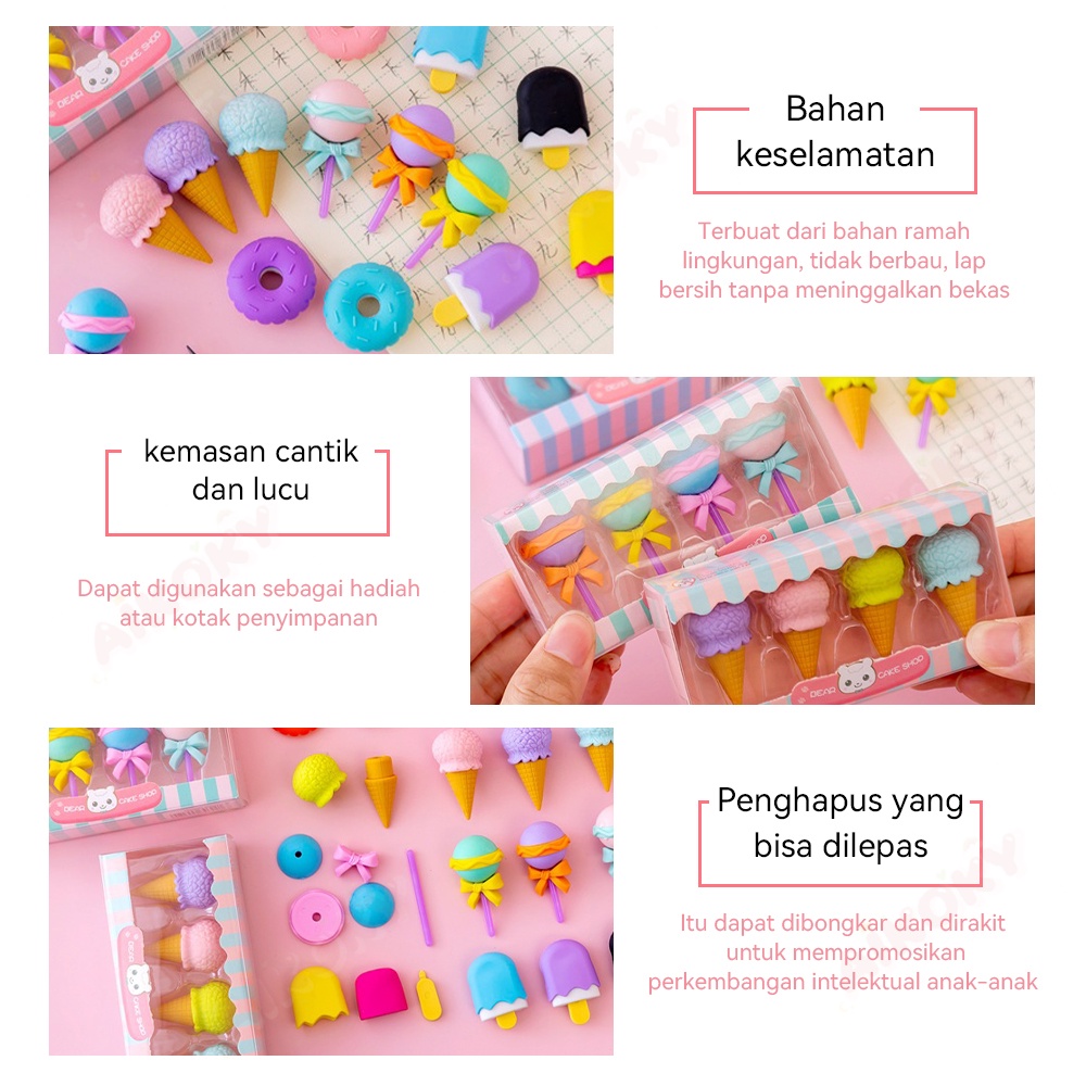 Detail Aikoky Penghapus Pensil 1 Set /4 pcs Ice Cream Lolipop Kerucut Donat Penghapus Set