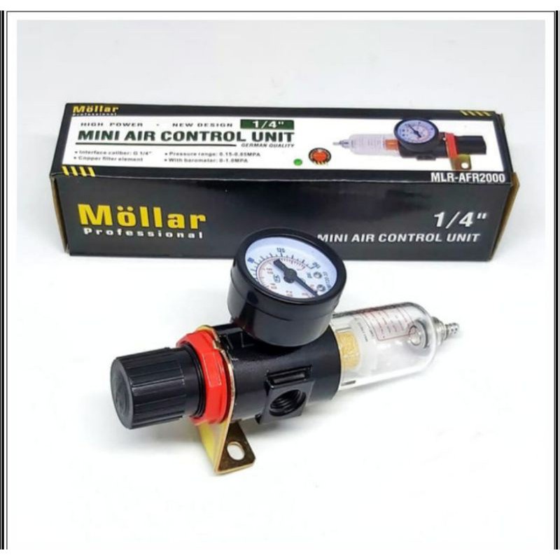 * Spesifikasi: - Mollar brand - Original - Type: MLR - AFR2000 - Port size : 1/ 4" - Barometer : 0-1 MPA - Pressure range : 0,15 - 8,5 bar - Auto drain - 2 Coupler