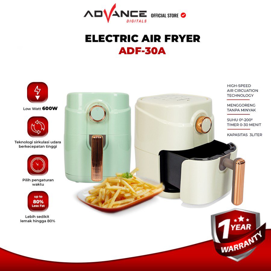 Advance Electric Air Fryer ADF-30A| Garansi Resmi 1 Tahun | Garansi resmi 1 tahun advance 1. Kapasitas 3 Ltr 2. Kontrol suhu 0 - 200 derajat celcius 3. Timer 0-30 menit 4. High Speed Air circulation technology 5. Keranjang makanan logam lapis Teflon yang Anti lengket 6. Sistem sirkulasi udara yang cepat membuat proses penggorengan lebih cepat dan aman lebih banyak listrik 7. Cara yang lebih sehat untuk memasak tanpa minyak dan 80% lebih sedikit lemak 8. Dilengkapi dengan pelindung overheat 9. Dilengkapi dengan kaki anti selip 10. Dengan bel siap otomatis untuk membunyikan alarm saat makanan sudah siap (pengatur waktu) 11. Bagian-bagian yang mudah dicuci dan dibersihkan 12. Menggunakan Daya Sebesar 600watt yang mana merupakan air frayer dengan penggunaan listrik terendah dari pada air frayer lain Watt/Voltase : 600W / 220-240V / 50-60Hz - Kapasitas 3 Ltr - Mudah digunakan - Energi yang aman - Makanan yang lebih sehat - Mudah dibersihkan Material : Plastik ABS, Stainless Steel, Cara Penggunanaan : 1. Buka wadah makanan 2. Masukkan makanan & bahan yang Anda inginkan 3. Tutup wadah 4. Atur pengatur waktu 5. Tunggu sampai makanan siap lalu sajikan