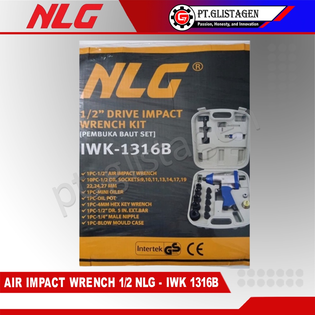 DETAIL PRODUCT NLG IWK-1316 B : 1/2 Air Impact Wrench : 1 Pcs Specifications: - Square Drive 1/2 inci - Bolt Capacity 5/8 inci - Air Consumption 4.0 cfm - Maximum Torque 230 ft-lb - Maximum Free Speed 6700 RPM - Air Inlet 1/4 in - Air Hose 3/8 in - Operating Air Pressure 90 ps (6.2 bar) 1/2 Dr. Sockets ( 9 27 mm ) : 10 Pcs Mini Oiler : 1 Pcs Oil Pot : 1 Pcs Hex Key Wrench 4mm : 1 Pcs 1/2 Dr. 5 in.Ext.Bar : 1 Pcs 1/4 Male Nipple : 1 Pcs Blow Mould Case : 1 Pcs