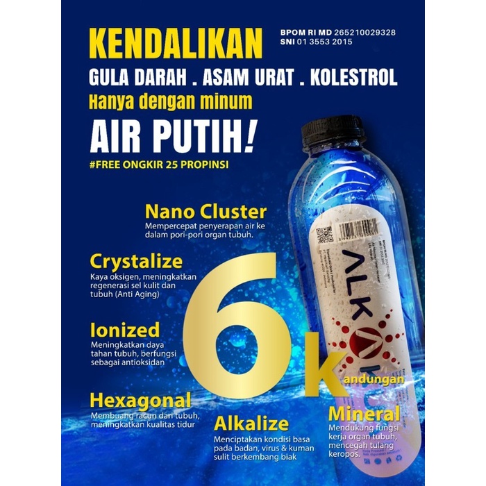 _*ALKAKUA*_ mengandung : • *Nano Cluster* Dengan ukuran 0,0000001micron penyerapan pada pori2 organ jauh lebih cepat • *Cristalize* Membentuk Kristal pada air shg bermuatan Oksigen lebih banyak, shg regenerasi sel kulit akan lebih baik • *Hexagonal* Dengan meningkatkan struktur Hexagonal dalam cairan tubuh, radikal bebas akan lebih mudah tertangkap dan dikeluarkan untuk metabolisme dan gula darah juga lebih baik karena terjadi detoxifikasi • *Ion* Berfungsi meningkatkan ketahanan tubuh dan membuang limbah kimia di dalam darah. Mengatasi virus dan kuman shg daya tahan tubuh terhadap Pilek, flu, alergi akan lebih baik • *Alkalis* Meningkatkan kondisi basa di dalam tubuh utk menghambat perkembangan bakteri, virus, jamur dll • *Mineral* Tubuh tidak memproduksi mineral, namun kalsium, kalium, magnesium, sangat dibutuhkan tubuh untuk mendukung organ2 tubuh agar berfungsi optimal