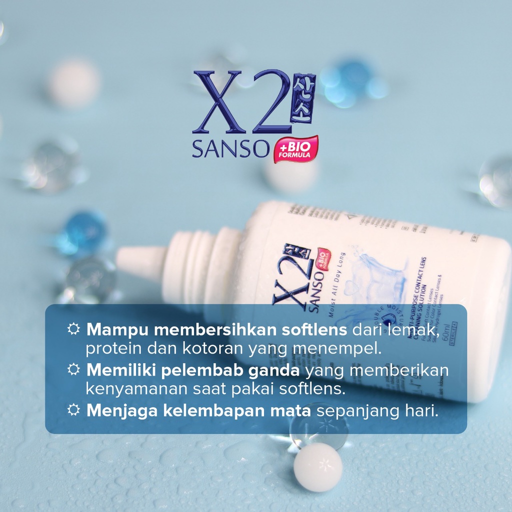 X2 Sanso + Bio Formula Multi purpose solution with HPMC & sodium hyaluronate For all soft contact lenses Suitable for color contact lenses Silicone hydrogel lenses Remove proteins & lipids No AKL : 21204220168