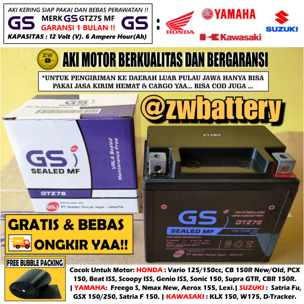 AKI MOTOR ORIGINAL GSJ GUM SUNG JUN GTZ7S / GTZ6V / YTZ6V / MTZ6S / RBTZ7S MF. GARANSI 1 BULAN !! KAPASITAS 12 VOLT 6 AMPERE. UKURAN SAMA DENGAN BAWAAN MOTOR ANDA, AKI KERING SIAP PAKAI.