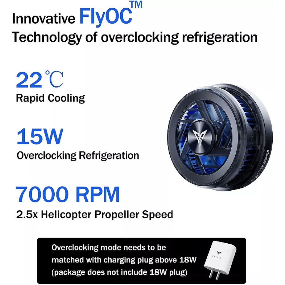 FLYDIGI B5X juga menggunakan teknologi FlyOC Overclocking Cooling Tech, yang mampu meningkatkan kemampuan pendingin hingga 50% dengan kecepatan 7000 RPM (MENGGUNAKAN KEPALA CHARGER 18W!!).