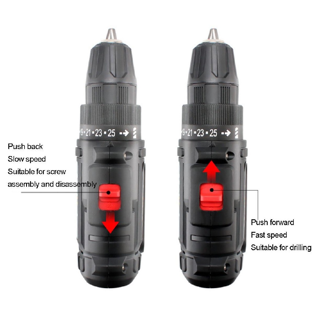 Main Features: - Ergonomic comfort grip handle provides ideal balance and tool control - With in LED workung light, provides illumination in dark spaces as you work - Powered by Li-ion rechargeable battery, provide longer running time and more power - 0-750RPM and 0-1850RPM High/Low 2-speed variable for a wide range of applications - 25 + 1 stage settings - 3/8" keyless three-jaw drill chuck for quick and simple bit replacement, holding up to 10mm bit