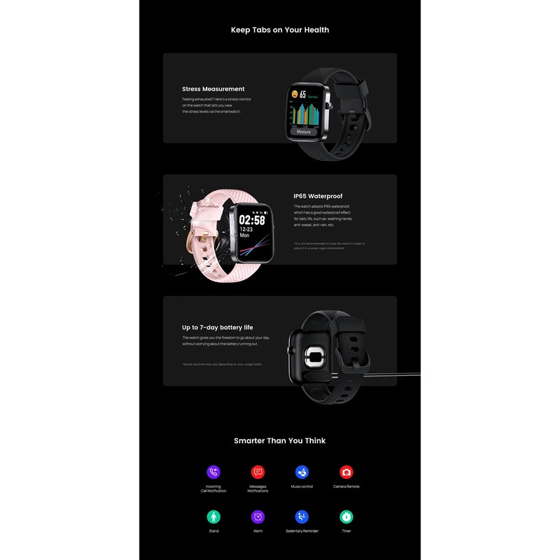 5. Blood Oxygen Saturation Monitoring 6. REM Sleep Analysis 7. Temperature tracking: watch can measure both your body temperature and the skin temperature 8. 11 Sports mode 9. IP65 Waterproof only for daily life (TIDAK REKOMENDASI UNTUK RENANG, AIR PANAS, MENYELAM) 10.Up to 7-day battery life 11.Other function:Incoming Call Notification, message, Music control,Camera Remote,Alarm,stand,timer,sedentary reminder