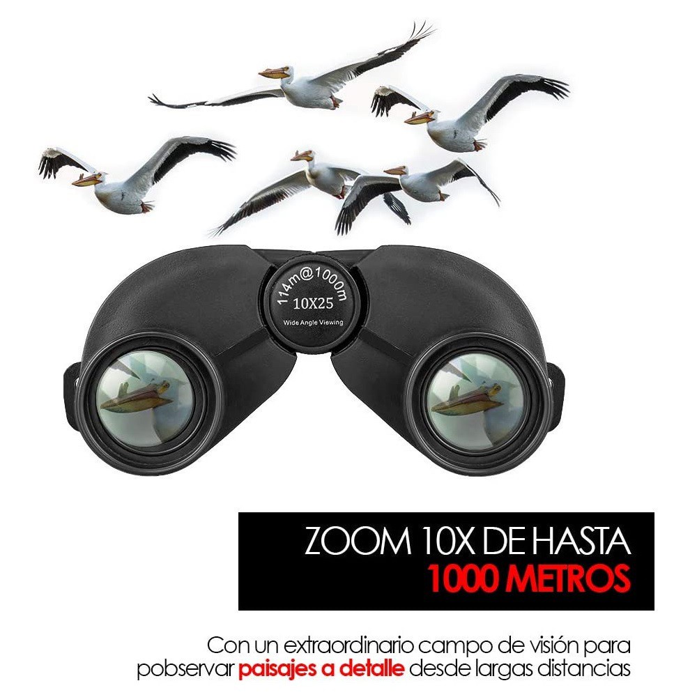Main Features: - VISION RANGE OF UP TO 1000M (10x): They have a field of view that ranges from 100 to 1000 m. In addition, they have a 25mm objective lens and a 65-degree angle of view, perfect for detailed observation no matter how far away the landscape is - EXPLORE NATURE WITH UNEQUALED BRIGHTNESS AND SHARPNESS: They are perfect for bird watching and other wildlife. The quality of the prism gives the image the brightness and clarity necessary for you to see every detail of the panorama vividly - MANUAL APPROACH TO OBSERVING MOVING SCENARIOS: Take a deep look and monitor any activity from a distance. When the lens moves you just have to adjust the focus, they are ideal to take to the stadium and watch sports - ERGONOMIC NON-SLIP DESIGN: The shape fits perfectly in the hands and the non-slip textured cover makes it easy to grip. In addition, the folding design allows you to close or open the peepholes as required by the height and distance between your eyes