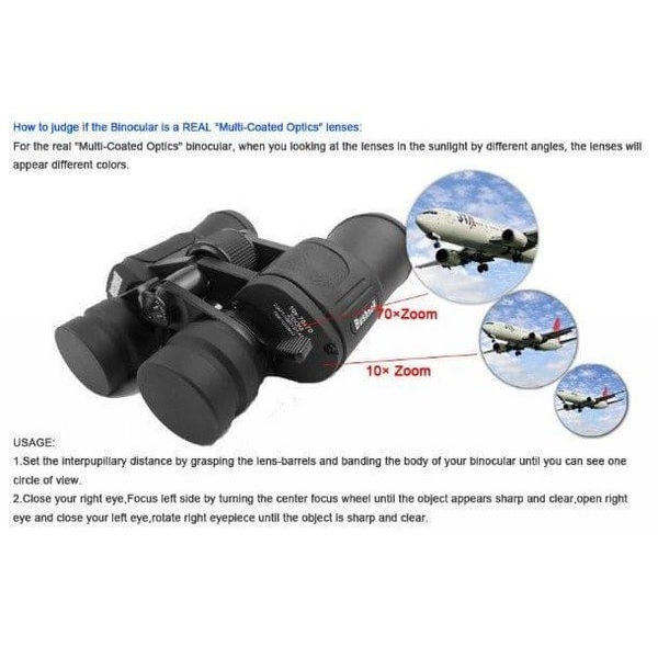 Specification: Brand: BUSHNELL Product Name: Ultra High Power Binoculars Product Model:PowerView 10-70X70 Magnification: 10-70x Close Focus: 14ft/4.3m Objective Diameter: 70mm Eye Relief: 12mm Exit Pupil: 5mm Field of View: 234ft/1000 yards at 10X (78m/1000m at 10X) Focus System: Center Prism Glass: BK-7 Prism System: Porro Lens Coating: Fully Multi-Coated
