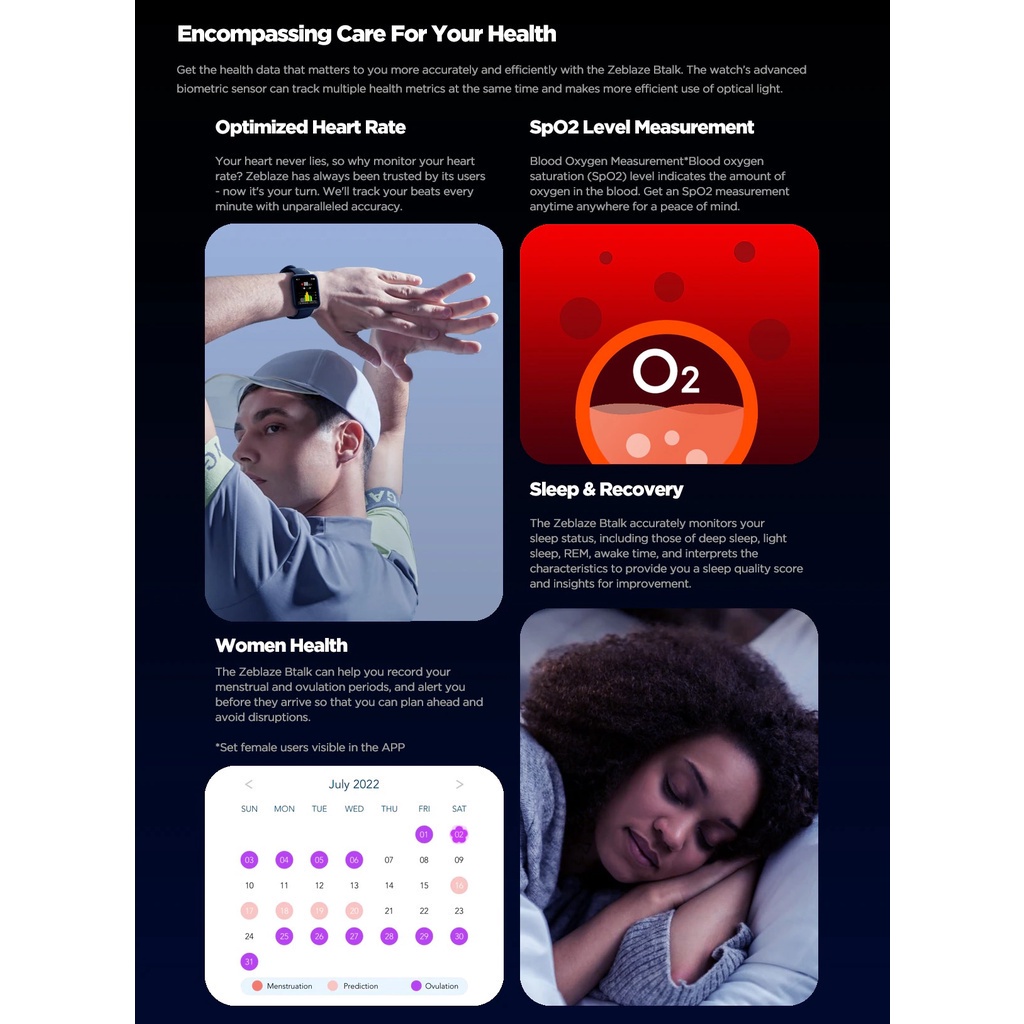 Fitur ZEBLAZE BTALK: 1. Voice Calling Features: One Touch to Connect, Voice Calling, Dial Pad, Recent Call, Contact 2. Time/Date, Automatic Daylight Saving Time, Stopwatch, Timer, Alarm 3. Wrist-based Heart Rate (Constant, Every Minute) , Daily Resting Heart Rate, Abnormal Heart Rate Alerts, SpO2(Blood Oxygen) Level Measurement, Women Health, Breath Training, Sleep Score and Insights, Calorie Burn Tracking 4. 100+ sports mode 5. Activity tracking record: calories burned, step counter, move bar, auto goal, real time pace & distance 6. Daily Smart Features: smart nofitication, Sync weather, find my phone and watch, Sedentary alert, do not disturb modes 7. Health Monitoring 24H heart rate 8. Waterproof IP68 9. 1.86 inch large color LED