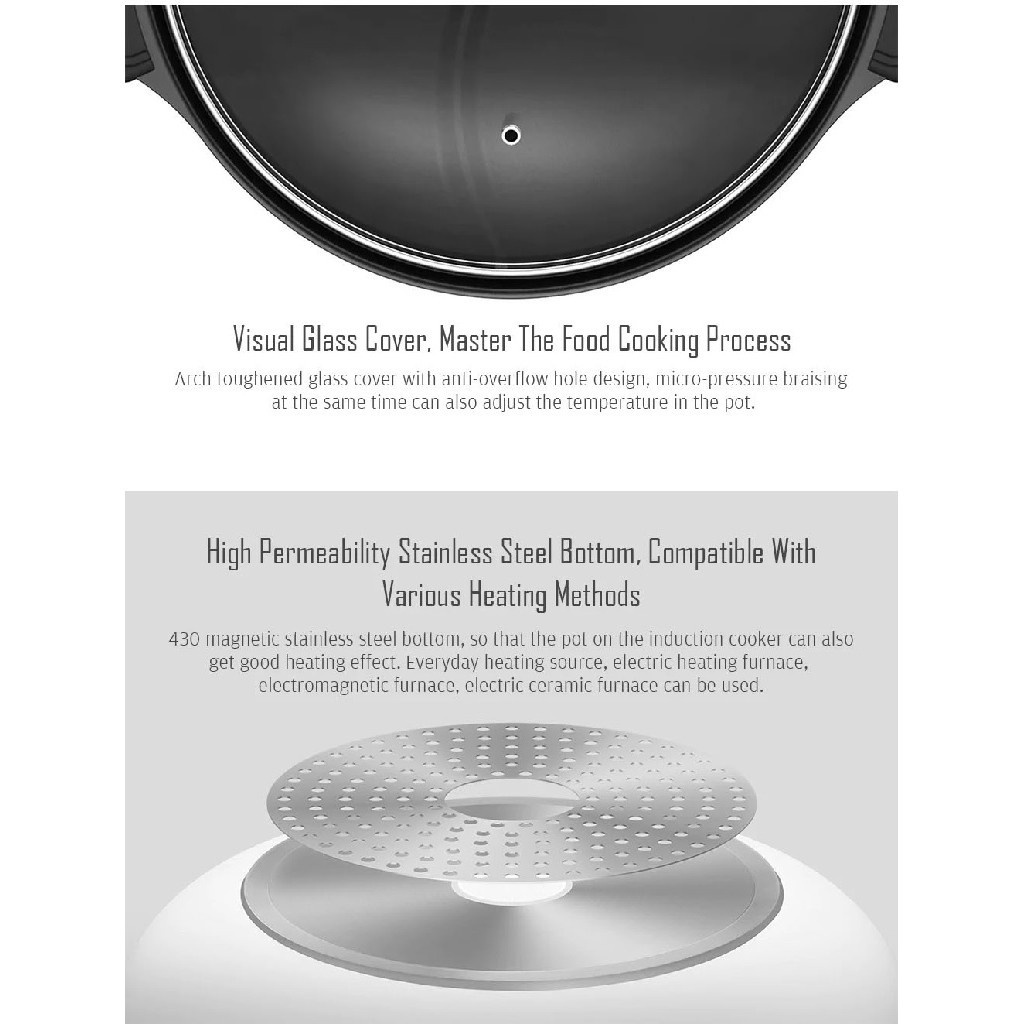 Main Features: - One-piece casting, strong and durable - "S" type space, anti-overflow and anti-odor - 4mm thickened composite pot bottom, heat up quickly and evenly - Safe and healthy, durable and easy to clean - Double ears insulated and non-slip silicone protective cover - Visual glass cover, master the food cooking process - High permeability stainless steel bottom, compatible with various heating methods
