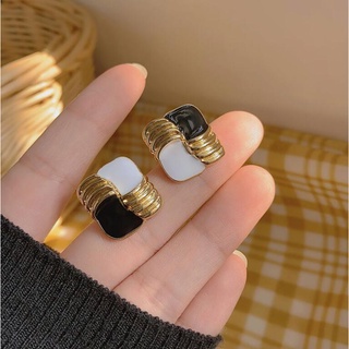 925 jarum perak hitam dan putih square stud anting-anting retro sederhana Korea pribadi fashion anti
