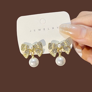 Anting Stud Desain Pita Aksen Kristal Mutiara Warna Emas Untuk Wanita