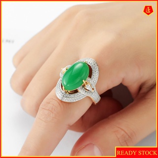 [Ready Stock]18K Gold Color Separation Inlaid Green Chalcedony Full Diamond Ring Luxury Elegant