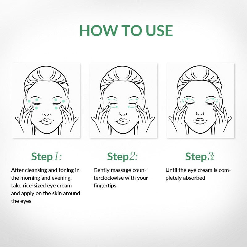 HOW TO USE 1.After cleansing and toning in the morning and evening, take rice-sized eye cream and apply on the skin around the eyes 2.Gently Massage counterclockwise with your fingertips 3.Until the eye cream is completely absorbed