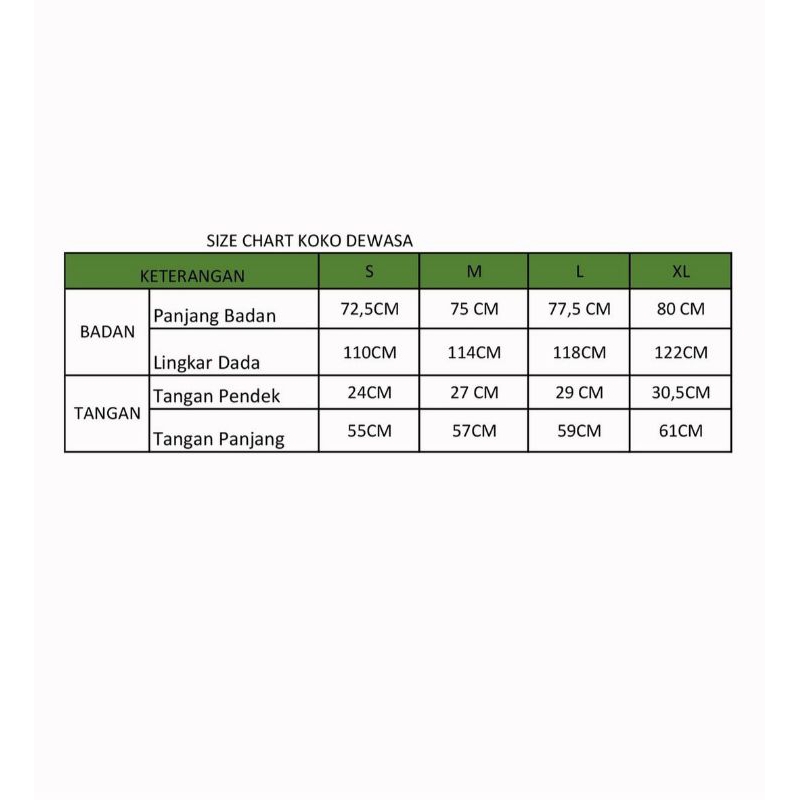 Size Chart Koko Dewasa PB x LD x Tangan Pendek x Tangan Panjang S : 72cm x 54cm x 24cm x 55cm M : 75cm x 56cm x 27cm x 57cm L : 77,5cm x 58cm x 29cm x 59cm XL : 80cm x 60cm 30,5cm x 61cm
