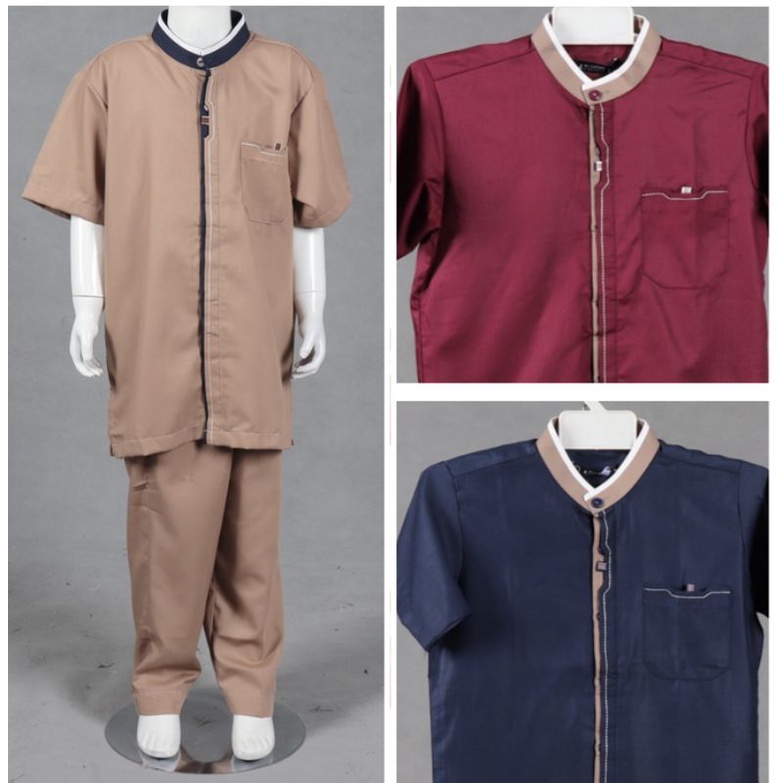 Setelan koko anak pria lengan pendek dengan variasi bordir dilengkapi dengan peci berwarna senada.
