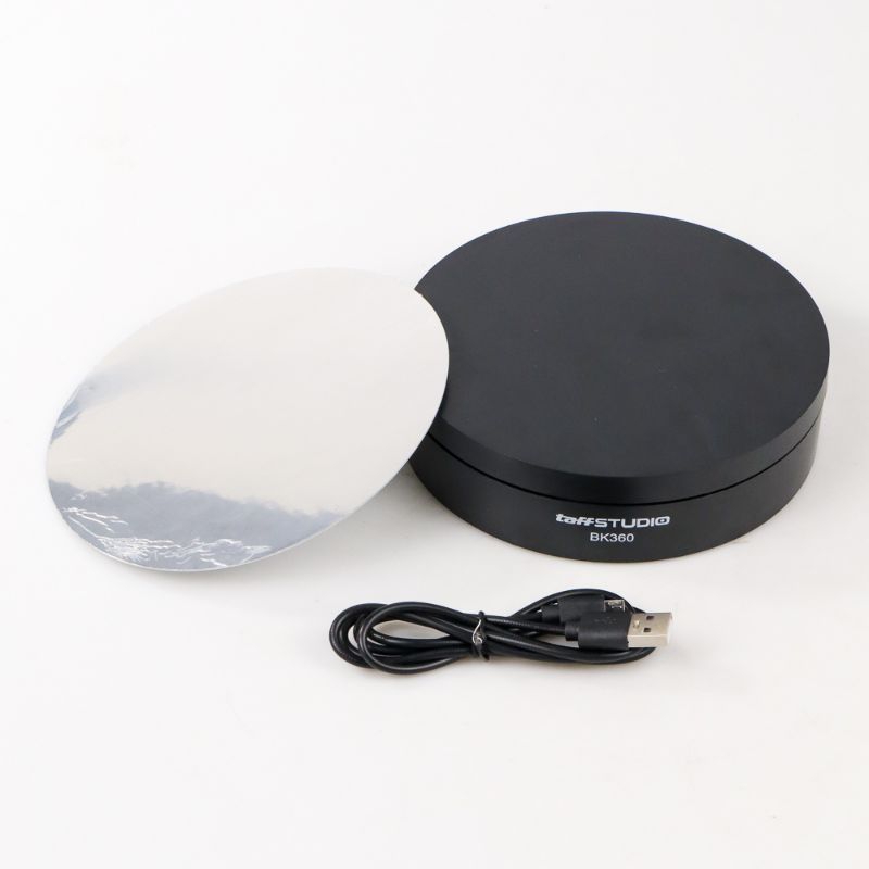 1 x TaffSTUDIO Alas Putar Fotografi Rotating Display Stand Base 13.5cm - BK360 1 x Kabel Micro USB 1 x Alas Reflektif