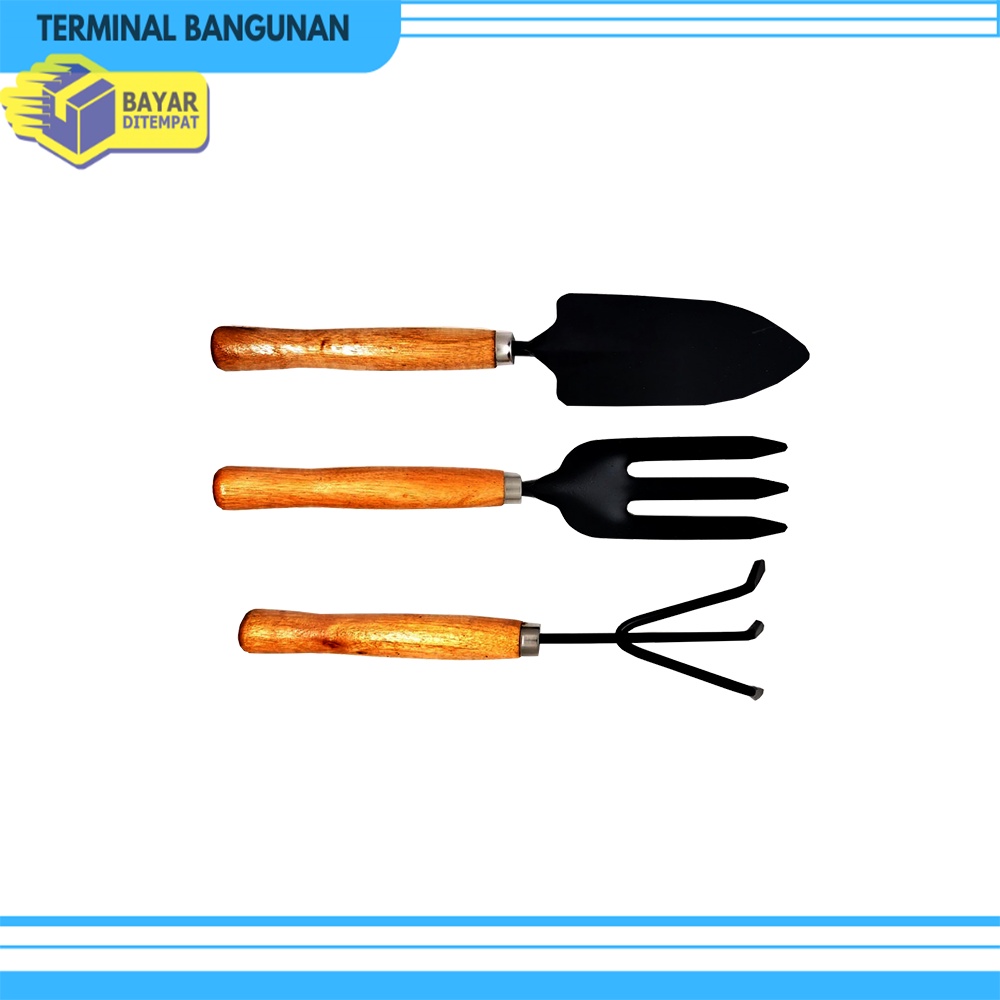 1 set terdiri dari: -- Garpu panjang 25cm lebar 2 inch -- Sekop panjang 25cm lebar 2 inch -- Garukan bengkok panjang 23 cm lebar 2 inch