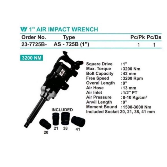SPESIFIKASI AS725B : Torsi Maximal : 3200 N.m Putaran tanpa beban : 3200 rpm Panjang keseluruhan ujung : 9" (225mm) Drat inlet udara : 1/2" Diameter selang minimal : 13mm (selang besar) Tekanan udara minimal : 8-10 Kg/ Cm3 Torsi Momen kerja : 1500 - 3000 N.m Dapat 4 mata socket : 20mm , 21mm , 38mm , 41mm