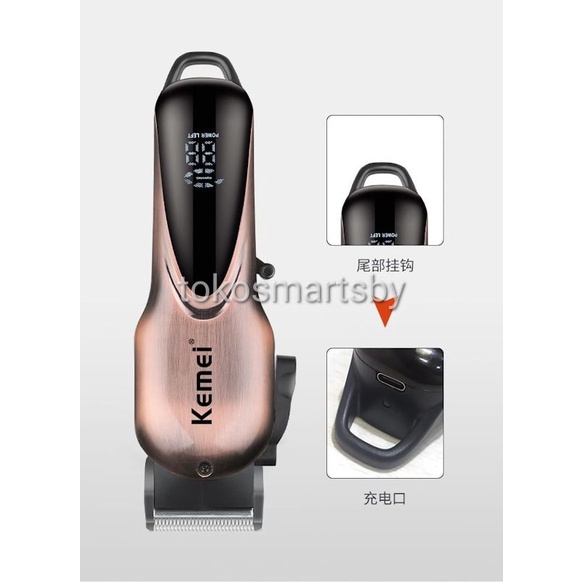 Deskripsi alat Cukur Rambut Kemei KM-6372Hair Clipper LCD Display Hair Trimmer High power pure copper motor Voltage: 100v-240v, 50 / 60Hz, Size: 19 * 5 * 4cm Limiting comb (4) 3/6/9/12 mm LCD digital display: battery power / oil / power display, Carbon steel blade sharp Adjustable blade